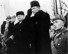 Päts was one of the candidates in the presidential elections that were supposed to be held in April 1934, but the Vaps Movement candidate Andres Larka and even lieutenant general Johan Laidoner were both clearly more popular candidates than Päts in the public opinion. The campaign was accompanied by threats by the Vaps Movement to take power and rumours of a forthcoming coup. In early March 1934, Päts's political opponent Jaan Tõnisson compared the Vaps Movement with the Nazis in Germany and advised the government to take necessary action against the movement.[33] Konstantin Päts then carried out a self-coup on 12 March 1934.[35] He was supported by general Johan Laidoner and the army.[3]