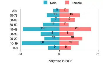 According to the 2002 Poland census, there were 250 people residing in Korytnica village, of whom 52% were male and 48% were female. In the village, the population was spread out, with 21.2% under the age of 18, 36.8% from 18 to 44, 20.4% from 45 to 64, and 21.6% who were 65 years of age or older.[1]