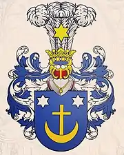 Azure, fitchée cross over a crescent, between two stars. On a crowned helmet, three ostrich feathers, charged with a star.[1]