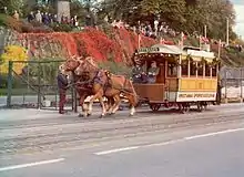 The second class consisted of fourteen units delivered by Skabo between 1887 and 1892. These were delivered in various configurations of open and closed seating and were normally only operated during winter. They had the same dimensions as the Stephenson cars.[1] The final class, built by Falkenried, consisted of fifteen units delivered in 1897. Measuring 6.6 meters (22 ft) in length, they were sufficiently heavy they needed to be hauled by two horses. This was a calculated choice, as they were primarily intended to be used as trailers for the electric trams.[6]
