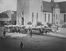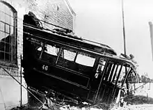 KSS had a concession which expired in 1905, at which time the municipality could purchase the company at par value. This raised a new debate concerning public or private operations, with many Conservative politicians calling for the privatization of KKS.[27] In the 1904 municipal election the issue was raised, with the Liberal Party and the socialist parties running for municipalization of tram operations. Meanwhile, the municipal administration worked with estimates for taking over KSS. A take-over would cost the municipality about NOK 2 million, while a sale would bring in about NOK 1.6 million. However, as KSS was a profitable company, it was estimated that the municipality would make more money by taking over KSS than selling KKS, estimated at about NOK 3 million for the period in question. The decisive municipal council meeting was held on 14 April 1905, although the actual vote did not occur until 02:00 hours the following day, after a nine-hour debate.[28] The Conservative majority voted in favor of selling KKS to KSS and extending the latter's concession to 1924.[29]