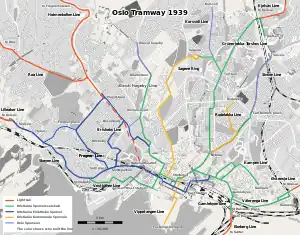 The next extension took place on 24 September 1909, when the Homansbyen Line was extended to Adamstuen.[32] In January 1910 the company introduced line numbers of its services. KES had done this a few months earlier and taken the first three digits, so KSS numbered their lines 4 through 10.[33] From 1912 the two companies started to cooperate closely with their routes. This first materialized in a connecting line in Hegdehaugsveien, which allowed trams to run from Stortorvet via the Homansbyen Line to reach the Briskeby Line and Majorstuen. At Skillebekk a connection was built through Munkedamsveien, allowing the Vestbanen Line access to the Skøyen Line. The third connection opened in 1915, linking Jernbanetorget to the Kampen Line and the Vålerenga Line through a connection along Vognmannsgata, Brugata and Vaterland Bridge, allowing trams from there to serve Oslo East Station.[34]