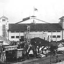 The Sumo Association has owned the site of the former Tokyo Technical High School at the base of Kuramae Bridge since before World War II. The construction plan for the new Kokugikan was underway since around 1940 but was suspended due to the war. After the war, the old Kokugikan was occupied by the allied forces enforcing the budo ban, forcing the Japan Sumo Association to hold tournaments and Sumo venues in shrines and baseball stadiums.[3] Due to resource shortages after the war, the beginnings of the arena were built using the scraps from the demolition of the naval hangar of Atsugi.[4] The target capacity was 11,000 spectators. From 1950 to 1953, main tournaments were held at the Kuramae Kokugikan, which was still under construction.