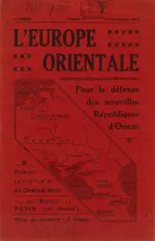 L'Europe orientale: pour la defense des Nouvelles Républiques d'Orient (Eastern Europe: for the defense of the New Republics of the East) was a bi-monthly magazine published in Paris from September 1919 to January 1920.[1][2] Separate print editions were issued in French and English, the latter carrying the title The Eastern Europe.[1][3] L'Europe orientale campaigned for recognition of the "Allogenian nations" (i.e. the non-Russian nations in the border lands) by the Entente during the Paris Peace Conference.[1] The publication was distributed in the United States, Canada and Switzerland.[1]