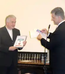 Marcelo Bomrad Casanova, editorial director of L’Italiano giving the prize awarded to Pope Francis to his Ambassador to Argentina Mons. Emil Paul Tscherrig