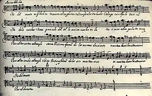 - ↑ English translation: La púrpura de la rosa, musical performance in festive celebration of the 18th birthday and first year of the reign of our King, Don Phelipe Quinto. ~ His Excellency, the Count of Monclova, Viceroy, Governor, and Captain General of the realms of Peru, Tierre Firme, and Chile & composed by Don Tomás de Torrejón de Velasco, music master of the Cathedral of Ciudad de los Reyes. In the year 1701. (Ciudad de los Reyes was the name for Lima during the Spanish Viceroyalty of Peru)