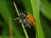 These beetles are 75–10 millimetres (2.95–0.39 in) long, the head and pronotum are black, the elytra are bright yellow-orange, with six black dots.
