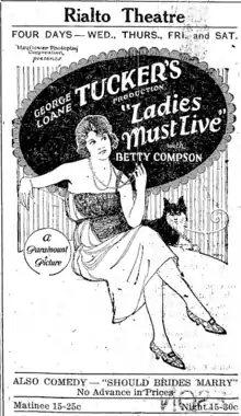 Ladies Must Live is a 1921 American silent societal drama film directed by George Loane Tucker and released by Paramount Pictures. It was the last directorial effort of George Loane Tucker and was released four months after his death. Betty Compson stars along with Leatrice Joy, John Gilbert and Mahlon Hamilton.[1] It was one of the few instances where future husband and wife Joy and Gilbert appeared in the same film.