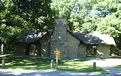 On November 15, 1990 three areas of the park were listed on the National Register of Historic Places. Their historic importance is derived from their association with the CCC. The park was part of a larger study of Iowa's state parks called the Civilian Conservation Corps Properties in Iowa State Parks: 1933-1942. Area A focuses on a picnic area that includes the park's entrance portals, a picnic shelter, two latrines, three fountains, a footbridge, and the associated landscaping and trails. These facilities were built from December 1934 to April 1935.[4] Area B includes the bathhouse, restroom, and concession. Company 769 began construction of these facilities in May 1935, and the side camp completed them by September 1937.[6] Area C is the lodge or refectory. It was begun in July 1936 and completed in July 1937.[7] The Rustic style was used in the design of the buildings. The significance of this architectural style is that it was designed to blend into its natural surroundings by means of its material, design, and workmanship.[4] Areas A and B are historic districts, while Area C is an individual listing.