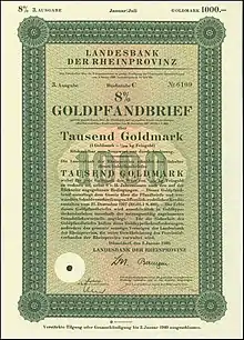 The Rheinische Provinzial-Hülfskasse was established in Cologne on 7 February 1854 with capital of 400,000 thalers, on a statutory basis of 24 November 1853.[3] Its mandate was not about making profits but "supporting institutions, municipal buildings or commercial companies with loans, paying off municipal debts, and promoting the savings bank system through centralized management of savings."[4]