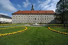 The Great Armorial Hall is located on the first floor of the west wing. It extends over both upper floors and is 9.8 meters high. The floor space measures 23 × 13 meters, and the dimensions of the hall have remained unchanged since 1581. The hall originally had frescoes and a ceiling painting by Anton Blumenthal, but these were destroyed in a fire in 1723. The walls and ceiling of the hall were then redesigned by Josef Ferdinand Fromiller, and since then only individual coats of arms have been added.[18]