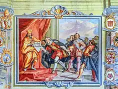 On the ceiling is a fresco by Fromiller. The ceiling mirror is framed by an "excellently constructed mock architecture in terms of perspective". The all-around portico with niches in the corners represents. In the niches are Grisailla statues of the Habsburg rulers Matthias, Ferdinand II, III, and IV. The cardinal virtues are depicted in balustrades in the center of each side. No sky opens above the mock architecture, but the hereditary homage of Emperor Charles VI is depicted. This had taken place on 22 August 1728 in the then Palais Rosenberg, now the town hall of Klagenfurt. However, Fromiller architecturally relocated it to the Great Hall of Heraldry. The emperor sits under a red canopy and is surrounded by the deputies, the ecclesiastical dignitaries, the duke's farmer, and the holders of the eleven provincial offices. The coats of arms of the latter as well as the coats of arms of Austria, Carinthia, and the ecclesiastical territories of Salzburg and Bamberg at the edge of the picture connect the homage scene with the mock architecture.