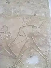 Lassos are not only part of North American culture; relief carvings at the ancient Egyptian temple of Pharaoh Seti I at Abydos, built c.1280 BC, show the pharaoh holding a lasso, then holding onto a bull roped around the horns. Huns are recorded as using lassos in battle to ensnare opponents prepared to defend themselves in hand-to-hand combat around AD 370.[22] They were also used by Tatars and are still used by the Sami people and Finns in reindeer herding. In Mongolia, a variant of the lasso called an uurga (Mongolian: уурга) is used, consisting of a rope loop at the end of a long pole.