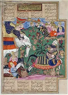 "Rustam Lassoes the Khaqan of China from His White Elephant", Persian miniature from Shahnama