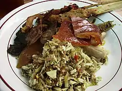 Lawar (Balinese: ᬮᬯᬃ) is an Indonesian dish created from a mixture of vegetables, coconut, and minced meat mixed with rich herbs and spices, originating from Bali, Indonesia. This dish is commonly found in restaurants and warungs in Bali. Despite its rich vegetable mixture, lawar is not a vegetarian dish, since most often it is mixed with minced meat or even blood.[1]