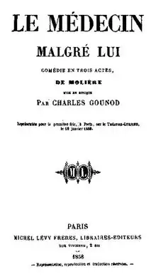 Le médecin malgré lui (The Doctor in spite of himself; sometimes also called The Mock Doctor) is an opéra comique in three acts by Charles Gounod to a libretto by Jules Barbier and Michel Carré after Molière's play of the same name. The work premiered at the Théâtre Lyrique in Paris on 15 January 1858.[1]
