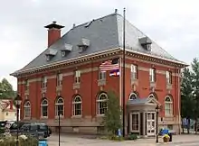 Richardsonian Romanesque[9] | The building's first occupant was the American National Bank. It has a 17-foot tower of red sandstone topped with a bell shaped metal painted dome.[18] |