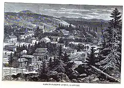 "At the foot of Chestnut street, a little distance from the Leadville Smeltering Company's works, in an acre plot of ground unfenced, and with the carbonate-like earth thrown up into little heaps. On a closer inspection, the stranger will see that many of these carbonate mounds are marked by pieces of boards, slabs and sticks. Two or three have marble slabs and as many more are marked by pine [wood] boards painted in imitation of marble. ... [It was a] barren red clay-colored plot [with] no flowery lawns, spouting fountains, shady nooks, grassy plats, nor artistically carved marble. ... A worse or less inviting spot for the repose of the dead could not have been found within the environs of our city. Here all the vast transportation of a great mining camp passes in daily bustle and confusionis, and the sleep of our dead forever disturbed by the oaths and the 'black snake' of the irreverent freighter [train]."[7]