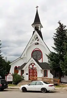 Carpenter Gothic[9] | The Episcopal church was built as a small replica of St. George's Church in New York City. The architectural features include hand-hewn beams and gothic arches of native timber, plaster walls, and unusual "tinted glass" windows. The windows were created using the technique of painting clear glass and glazing in a furnace[11] |