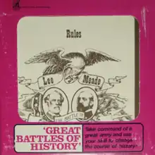 Rather than selling individual games in stores or via mail-order, RGA decided to sell a series of wargames via subscription. Players who subscribed to the series titled "Command Series, Volume I" received the first game as well as a large box with enough room to store the entire series of games.[3] A "Universal Command Series Package" was also included that contained a Universal Turn Recorder (a turn record track for up to 30 turns), TAC Cards (6 white cards and 6 red cards numbered from 1–6), and a six-sided die.[4] Subsequent games then arrived every six weeks. Lee vs. Meade was the first game in this subscription series, a wargame designed by David Isby, and published by RGA in 1974 packaged in an "LP album". In all, RGA would publish nine games in the series.[2]