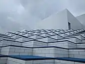 Many features of the building's architecture incorporate the standard design elements of the Lego brick. The modular spaces were built with the exact proportions of a Lego brick, while the white tiles that cover the building also have the proportions of a classic 2x4 brick. In addition, the porthole skylights in the roof of the Keystone Gallery, which sits on top of the entire structure, are circular to mimic eight studs on the top of a Lego brick, and radiate eight beams of light to welcome visitors.[6] The roof terraces were also painted in bright colours to mimic the bright colours of Lego bricks.[7]