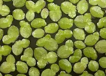 Lemna aequinoctialis, the lesser duckweed,[2] is a tiny, floating aquatic plant in the aroid family, found in quiet, still waters of the Southern U.S., as well as México and some Caribbean Islands. Additionally, it can be found from the state of Virginia south through Florida, north to Nebraska and even into southern Wisconsin. It is also widespread in the American Southwest (and most of México, including desert), from Texas to the coast of California, preferring lagoons and still ponds, which it accesses via seasonal flooding and occasional precipitation. Fronds are generally triple-nerved, green, and measure up-to 6 mm long. Flowers are single-ovulate, with a small utricular scale open on one side. Seeds have 826 ribs.[3]