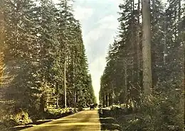 Hand-tinted photograph of Green Timbers, along Pacific Highway (now Fraser Highway) in Surrey. 1923 to 1927.