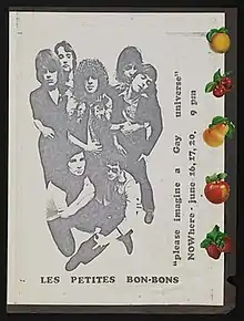 Les Petites Bon-Bons was a group of conceptual/life artists that originated in Milwaukee, Wisconsin, in the early 1970s. Their activities spanned the nascent gay activist movement, the international correspondence network and the Hollywood glitter rock scene.[1] They are known largely by the work of Jerry Dreva and Robert Lambert, aka Jerry and Bobby Bonbon, and who achieved much of their fame by effectively manipulating major media outlets.[2]