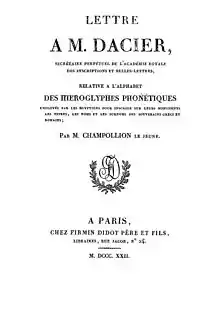 Lettre à M. Dacier (full title: Lettre à M. Dacier relative à l'alphabet des hiéroglyphes phonétiques: "Letter to M. Dacier concerning the alphabet of the phonetic hieroglyphs") is a letter sent in 1822 by the Egyptologist Jean-François Champollion to Bon-Joseph Dacier, secretary of the French Académie des Inscriptions et Belles-Lettres. It is the founding text upon which Ancient Egyptian hieroglyphs were first systematically deciphered by Champollion, largely on the basis of the multilingual Rosetta Stone.