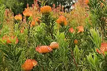 Leucospermum catherinae is a large evergreen, upright shrub of up to 4 m (13 ft) high from the family Proteaceae. It has hairless, inverted lance-shaped 9–13 cm long and 1–2½ cm wide leaves with a distinct stalk and three or four deep and blunt teeth toward the tip. The flower heads become disc-shaped with age, about 15 cm (5.9 in) in diameter, consisting of pale orange flowers. From the center of each flower emerges a long initially orange, later coppery bronze style with a thickened magenta tip that is bent clockwise, giving the entire head the appearance of a whirling pincushion. It is called Catherine-wheel pincushion or wheel flower in English and waterluisie in Afrikaans. Flowers can be found between September and December. It is an endemic species limited to the southwest of the Western Cape province of South Africa.[2]