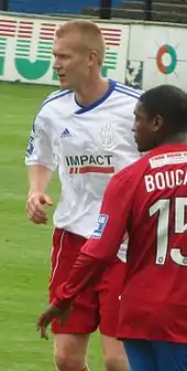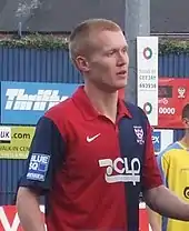 A muscle strain forced Mackin to miss a pre-season friendly against Shrewsbury Town in July 2008 and he returned to pre-season training later that month.[42][43] He was shown a red card after picking up two yellow cards in his first appearance of 2008–09, which was Wrexham's first match in the Conference Premier, as they beat Stevenage Borough 5–0 at home on 9 August 2008.[44][45] On reflection, Mackin said "As for the second yellow I felt the ball was there to be won and I thought that's what I did. Looking back now I know I should have stayed on my feet".[44] He was handed a one-match suspension and returned in a 1–1 draw away to Rushden & Diamonds on 17 August 2008.[45][46] Mackin scored his first goal of the season with a 25-yard shot against Grays Athletic, which was Wrexham's only goal in a 2–1 away defeat on 20 September 2008.[45][47] Despite starting the season as a regular in the team,[45] he found opportunities hard to come by after the arrival of Dean Saunders as manager.[48]