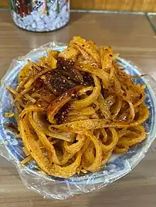 Liangpi (simplified Chinese: 凉皮; traditional Chinese: 涼皮; pinyin: liángpí; lit. 'cold skin') is a Chinese dish composed of cold skin noodles made from wheat or rice flour. It is a specialty dish originating from the cuisine of Shaanxi Province, but has now spread throughout all of China. In northwestern areas of China, it is often called liangpi zi (凉皮子). Although liangpi is served cold, they are served in every season, including winter.