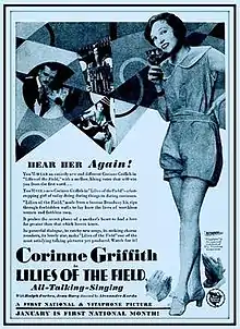 Lilies of the Field is a 1930 American Pre-Code musical drama film directed by Alexander Korda, and starring Corinne Griffith, Ralph Forbes, and John Loder. It was a remake of the silent 1924 film Lilies of the Field, in which Griffith had played the same role.[1] Both films were based on a 1921 play of the same name by William J. Hurlbut. Lilies of the Field was Griffith's first all-dialogue film. The film is not related in any way to the 1963 film of the same name.