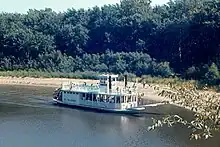 In the summer of 1961, after a period of design and fabrication by Dubuque Boat & Boiler Works at Dubuque, Iowa, the new sternwheel steamboat Talisman made its way to New Salem by way of the Mississippi River, Illinois River, and the Sangamon River.[11] The steamer, christened Talisman, was a scaled-down representation of the previous vessel, at 40 tons and 73 feet in length, with an upper cabin and powered by a 60 bhp diesel engine.[12] The recreation boat was given a landing next to the Rutledge Camron Saw and Grist Mill site on the riverbank, and tourists had the opportunity to take short excursions on the river. Unfortunately, just like the original Talisman, the recreated steamer was plagued by low water levels on the river which gradually increased the difficulty of navigation over the years until in 1998 the river dam at Petersburg was abandoned and water levels became too low.[12] The boat was finally grounded a few miles upriver from the historical site, and then served as a large lawn decoration about a hundred feet from the riverbank.[12] On November 19, 2021, the boat was destroyed in a controlled burn.