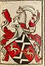 - ↑ Schild von Roth und Silber gespalten und darüber eine schwarze Zwergstrasse or Mauer mit vier Zinnen