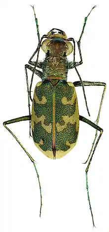 Cicindela is a large genus of tiger beetles, found worldwide. Cicindela includes more than 370 described species in 23 subgenera.[1][2][3]