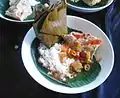 Buntil Java Fish dish Grated coconut mixed with anchovies and spices, wrapped in papaya, cassava, or taro leaves, then boiled in coconut milk and spice.