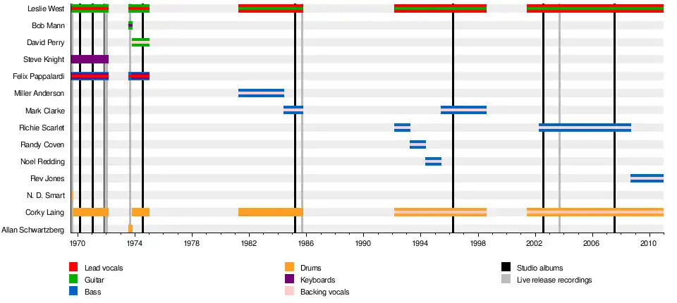 Mountain released Go for Your Life in 1985, which featured new bassist Mark Clarke.[6] Shortly after its release and promotion, the group quietly disbanded again. West and Laing returned as Mountain in 1992, with new bassist Richie Scarlet. After changing personnel again by replacing Scarlet with Randy Coven and later Noel Redding,[8][9] the group released its sixth studio album Man's World in 1996 with a returning Clarke on bass.[10] After another breakup in 1998, Mountain returned in 2001 to record Mystic Fire, which featured session bassist Chuck Hearne alongside West and Laing.[11] For the subsequent touring cycle, Scarlet returned to the band.[12] James "Rev" Jones took over in 2008.[13] West died of cardiac arrest on December 23, 2020.[14]