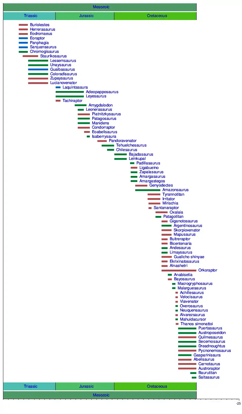 MesozoicTriassicJurassicCretaceousSaltasaurusBaurutitanAustroraptorCarnotaurusAbelisaurusGasparinisauraPycnonemosaurusDreadnoughtusSecernosaurusQuilmesaurusAustroposeidonPuertasaurusThanos simonattoiMahuidacursorAlvarezsaurusNeuquensaurusOverosaurusViavenatorVelocisaurusAchillesaurusMalarguesaurusMacrogryphosaurusBayosaurusAnabisetiaOrkoraptorAlnashetriEkrixinatosaurusGualicho shinyaeLimaysaurusAndesaurusBicentenariaBuitreraptorMapusaurusSkorpiovenatorArgentinosaurusGiganotosaurusPatagotitanOxalaiaSantanaraptorMirischiaIrritatorTyrannotitanAmazonsaurusGenyodectesAmargastegosAmargasaurusZapalasaurusLigabueinoPadillasaurusLeinkupalBajadasaurusChilesaurusTehuelchesaurusPandoravenatorIsaberrysauraEoabelisaurusCondorraptorManidensPatagosaurusPiatnitzkysaurusLeonerasaurusAmygdalodonTachiraptorLeyesaurusAdeopapposaurusLaquintasauraLucianovenatorZupaysaurusColoradisaurusGuaibasaurusUnaysaurusLessemsaurusStaurikosaurusChromogisaurusSanjuansaurusPanphagiaEoraptorEodromaeusHerrerasaurusBuriolestesMesozoicTriassicJurassicCretaceous