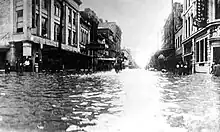 • September 9, 1900 – The 1900 Galveston hurricane makes landfall on the southern end of Galveston Island as a Category 4 hurricane.[1] The storm kills an estimated 6,000–12,000 people,[2] making it the deadliest natural disaster in United States history;[3] much of the damage occurs in the port city of Galveston, which is largely destroyed by a 15 ft (4.6 m) storm surge.[3] All Galveston homes are damaged, of which 3,636 are destroyed;[4] numerous public buildings and places of worship are also damaged or destroyed.[5][6] The damage toll is estimated at $30 million in the city.[4] Approximately 10,000 people in Galveston are left homeless, representing roughly a fourth of the city's total population.[7] Surrounding communities are also heavily impacted, incurring $3 million in damage;[8] several locales report the complete loss of homes and buildings.[9] Galveston undergoes significant changes in the storm's aftermath: the municipal governing apparatus changes to a city commission government, 2,146 buildings are elevated to facilitate the raising of Galveston Island, and a 6 mi (9.7 km) long and 17 ft (5.2 m) high seawall is built.[2]