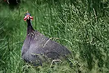 Helmeted guinea fowl in tall grass