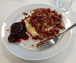 Denmark | A dish of mashed potatoes, topped with fried bacon and onions.[5] |