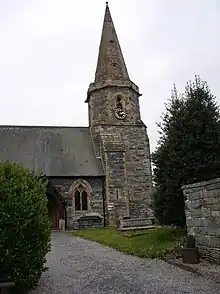 Saint Trillo who came from Brittany with other missionaries founded St Trillo's Church on a mound next to the Ceidiog stream close to its confluence with the River Dee.[4] The Grade II listed church was rebuilt in 1776, replacing an earlier medieval structure and underwent restoration in 1852 and 1885–1887, in the latter the porch, chancel and vestry were added and the nave and many fittings replaced or partly replaced.[5]