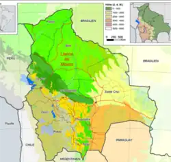 Differing definitions of the area comprising the Llanos de Moxos in northern Bolivia result in estimates of their size ranging from 110,000 square kilometres (42,000 sq mi) to 200,000 square kilometres (77,000 sq mi).[2] This area is characterized by flat terrain, many rivers and shallow lakes, and a tropical climate with pronounced wet and dry seasons. Fifty to sixty percent of the land is flooded from four to ten months per year.[3] The Llanos are located mostly in the drainage basin of the Mamoré River.