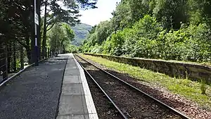 The station was constructed with two platforms and was an electric token block post, working to Glenfinnan on one side and Arisaig on the other, until the Up loop was lifted in 1966. The loops were lengthened during the Second World War and a new brick signal box erected, the foundations of which now can still be seen at the Arisaig end of the single platform now in use. The second platform fell into disuse in the 1970s.[6]
