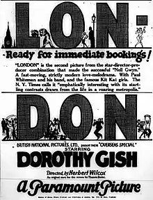 London is a 1926 British silent romantic drama film, directed by Herbert Wilcox and starring Dorothy Gish. The film was adapted by Wilcox from a short story by popular author Thomas Burke. The British Film Institute considers this to be a lost film.