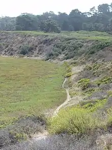 Los Peñasquitos Marsh Natural Preserve and Lagoon is a coastal marsh in San Diego County, California, United States situated at the northern edge of the City of San Diego, forming the natural border with Del Mar, California.[1] This bar-built estuary (a lagoon separated from the ocean by a mouth bar, a typical estuary for California[2]), previously called The Soledad Lagoon, divides a colony of the endangered Pinus torreyana on a narrow coastal strip.[3] Three streams empty into the lagoon: Carroll Creek, Carmel Creek (also known as the Carmel Valley Creek), Los Peñasquitos Creek with a total drainage basin area of 95 square miles.[4]