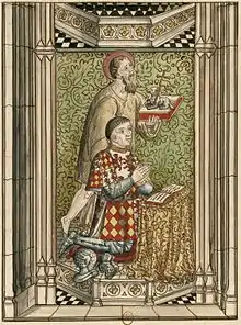 In June 1447, Louis was part of a prestigious embassy sent to Henry VI of England from Charles VII of France, asking for the return of the county of Maine in return for an extension of the truce.[9] Henry VI agreed and the county of Maine was returned to France by 15 March 1448.[9] After such success, Rene honoured Louis by making him the first of his knights of the Ordre du Croissant in 1448.[10][11]