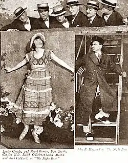 Groody began as cabaret dancer in New York and while still in her teens drew the attention of Broadway producer Charles Dillingham that led to a dancing role in the 1915 C. M. S. McLellan musical revue Around the Map. She would go on to appear in nine more Broadway productions, mostly musical comedies, of which four would prove to be major hits with runs of well over 300 performances. In 1920 the diminutive five-foot brunette[5] played Barbara, a principal role in The Night Boat, at the Liberty Theatre, and the following year she played Rose-Marie in Good Morning Dearie at the Globe Theatre. She played the title role Nanette in the 1925 hit No, No, Nanette, also staged at the Globe and in 1927, her favorite role, Loulou in Hit the Deck, at the Belasco Theatre. Audiences of the day most likely best remembered Louise Groody for the popular song "Tea for Two", from No, No, Nanette.[6][7]