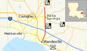 Louisiana Highway 59 (LA 59) is a state highway located in St. Tammany Parish, Louisiana. It runs 11.74 miles (18.89 km) in a north–south direction from U.S. Highway 190 (US 190) in Mandeville to LA 21 north of Abita Springs.